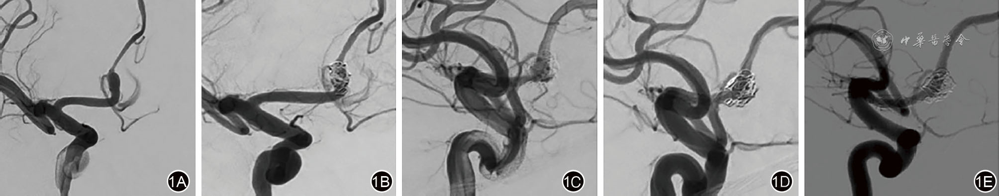 图1 大脑前A2段动脉瘤复发后二期治疗影像学资料 1A:术前右侧颈内动脉DSA示右侧大脑前动脉A2段动脉瘤,累及载瘤动脉的2个分支;1B:使用Neuroform Atlas支架辅助栓塞(载瘤动脉远端纤细,避免编织支架展开不充分或贴壁不良),术后造影示瘤颈少许残留(R-R Ⅱ级);1C:术后6个月行DSA检查示右侧大脑前动脉A2段动脉瘤支架辅助栓塞术后,瘤体残留(R-R Ⅲ级);1D:行复发动脉瘤二期治疗,置入1枚LEO Baby裸支架,术后造影示瘤颈少许残留(R-R Ⅱ级);1E:二期治疗后6个月行DSA检查示支架贴壁良好,动脉瘤完全闭塞(R-R Ⅰ级)。DSA:数字减影血管造影。