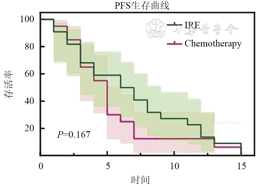 IRE组的中位OS14个月高于化疗组11个月,中位PFS7个月稍长于化疗组5个月,差异均无统计学意义(P>0.05);IRE组的平均住院时间为(5.9±0.75) d。IRE术后发生了5例严重不良反应,包括1例幽门水肿,1例梗阻性黄疸,2例胰腺炎及1例术中出血。术后疼痛评分相较于术前降低(P<0.05)。